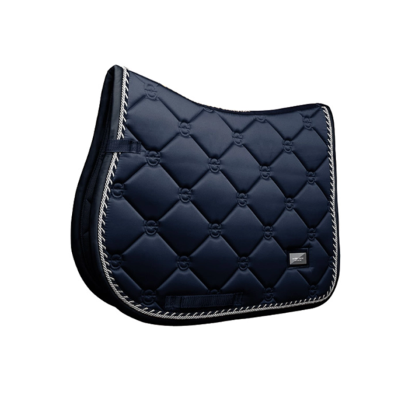 Our luxury jumping saddle pad in shiny navy is perfect for a day of competition or training! The saddle pad has ‘super quick dry’ inner material and shiny dirt repellent outer material with beautiful details in silver.